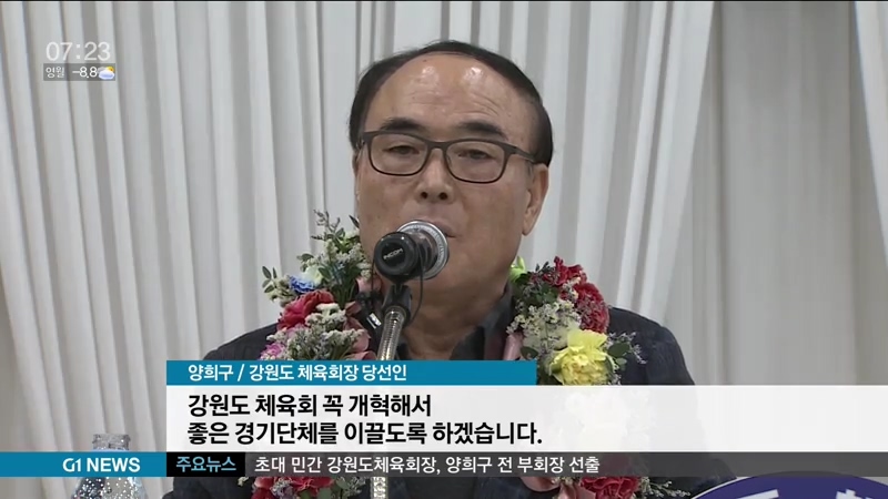 "강원도 체육회 꼭 개혁해서 좋은 경기단체를 이끌도록 하겠습니다. 각 시군마다 단체장님들과 선수들 만나고 화합해서 이끌어 갈 수 있도록 다짐하겠습니다."