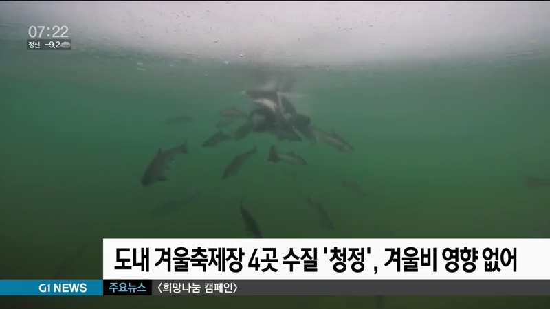 강원도 보건환경연구원은 화천 산천어축제와 인제 빙어축제, 평창 송어축제, 홍천 꽁꽁축제장 4곳의 수질 위생 안전성을 검사한 결과 장내병원성 원인균과 생태독성 등에서 청정성이 확인됐다고 밝혔습니다.