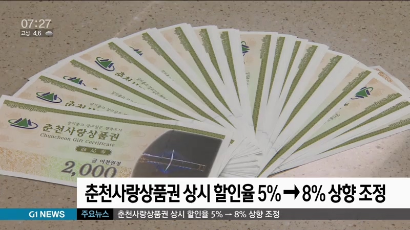 춘천시는 춘천사랑상품권의 상시 할인율을 현행 5%에서 다음달 3일부터 8%로 상향 조정한다고 밝혔습니다.