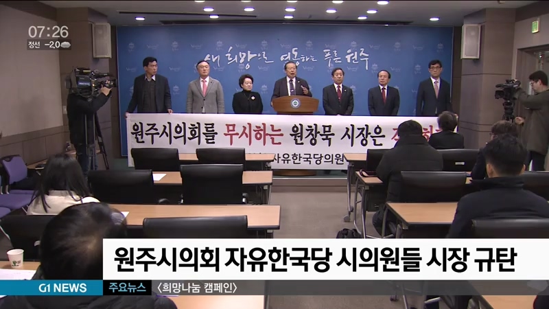 원주시의회 자유한국당 소속 시의원들이 어제(30일) 원주시청 브리핑룸에서 새해 첫 본회의에 불참한 원창묵 시장을 규탄하는 기자회견을 열었습니다.