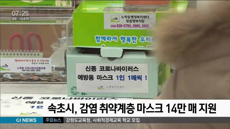 속초시는 방역마스크 14만 5천매를 긴급 수의계약으로 확보하고, 이르면 이달 말부터 저소득층과 노인복지 시설 등에 차례차례 보급하기로 했습니다.
