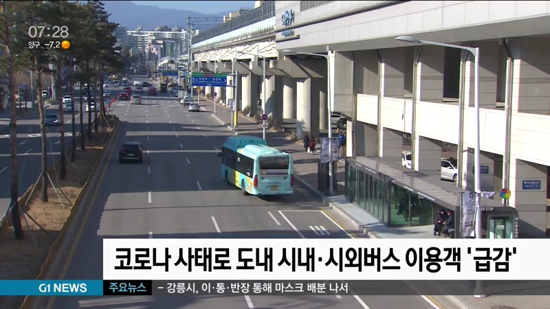 강원도 버스운송사업조합은 정부의 코로나19 대응단계가 심각단계로 격상된 이후 도내 버스 이용객은, 시내버스는 평균 40%, 시외버스는 70%가 줄었다고 밝혔습니다.