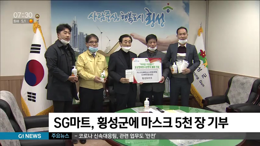 원주와 횡성지역 향토기업인 SG마트 관계자들은 오늘 유명환 횡성군수 권한대행을 통해 횡성군사회복지협의회에 마스크 5천장과 손소독제 100개를 전달했습니다.