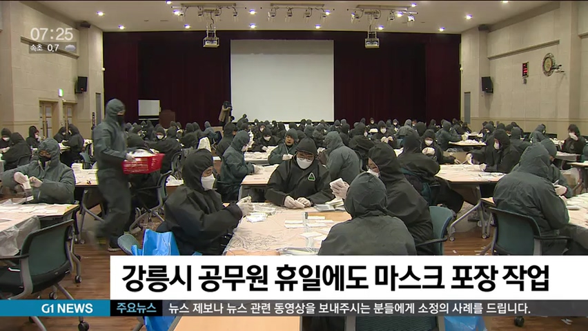 강릉시 공무원들이 휴일도 반납하고 일반 시민 들에게 나눠줄 마스크 포장 작업을 진행했습니다.