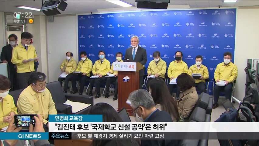 춘천-철원-화천-양구 갑 선거구에 출마하는 미래통합당 김진태 예비후보가 춘천 석사·퇴계·강남동 일대에 국제학교를 신설하겠다는 공약을 내자 민병희 도 교육감이 반박하고 나서 논란이 일고 있습니다.