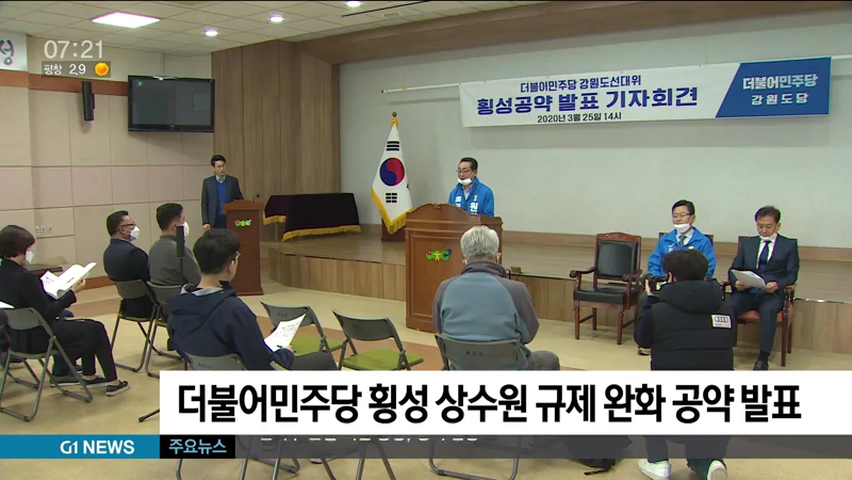 더불어민주당 이광재 강원권역선대위원장과 원경환 홍천·횡성·평창·영월 예비후보, 장신상 횡성군수 예비후보는 어제(25일) 횡성군청에서 합동 기자회견을 열고 상수원 규제 완화를 위한 공약을 발표했습니다.