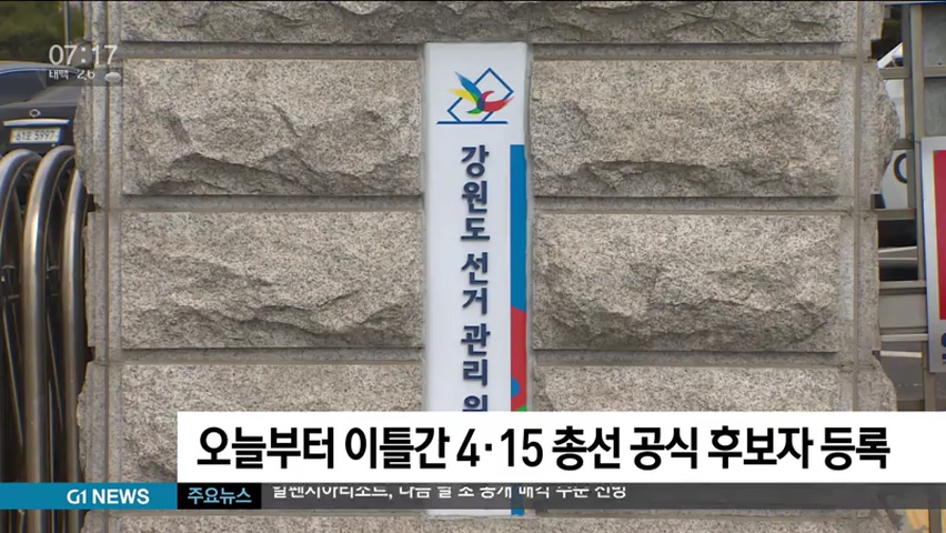 강원도선거관리위원회는 오늘부터 이틀간 오전 9시부터 오후 6시까지 관할 선거구 선거관리위원회에서 4·15 총선 후보자 등록 신청을 받는다고 밝혔습니다.