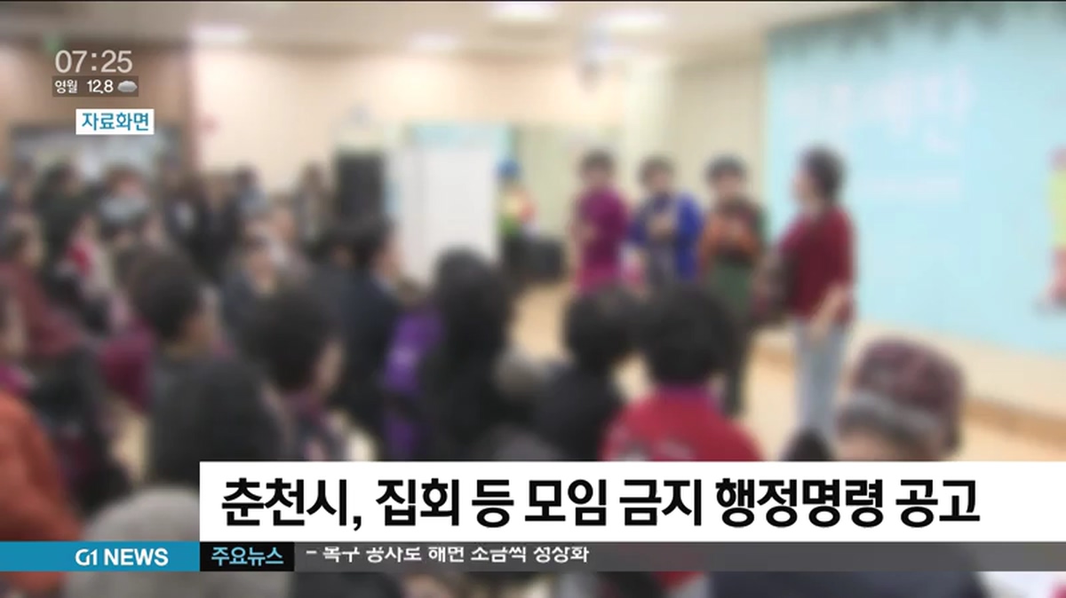 춘천시는 다음달 5일까지를 행정 명령 기간으로 정하고, 이 기간 영리를 목적으로 열리는 연극과 영화, 집회, 제례 등 여러 사람의 집합 모임을 금지한다고 밝혔습니다.