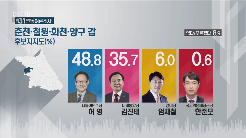 C.G.1./더불어민주당 허영 후보가 48.8, 미래통합당 김진태 후보가 35.7%로 13.1%p 차, 오차 범위 밖에서 허영 후보가 앞서고 있습니다.