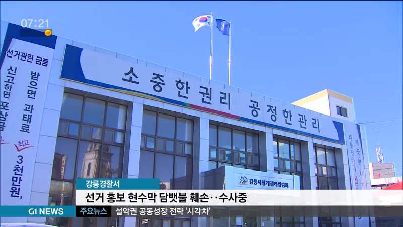 또 강릉시 교동 화부산 교차로에 걸렸있던 강릉 선거구 특정 후보자의 선거 홍보 현수막이 담뱃불에 훼손된 채 발견돼 경찰이 수사중입니다.