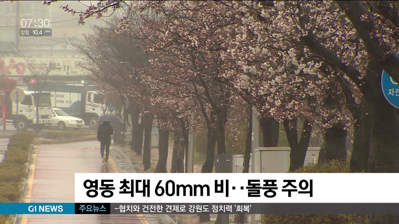 오늘 강원도는 종일 비가 내리는 가운데, 곳에따라 돌풍과 천둥 번개가 치는 곳이 있겠습니다.