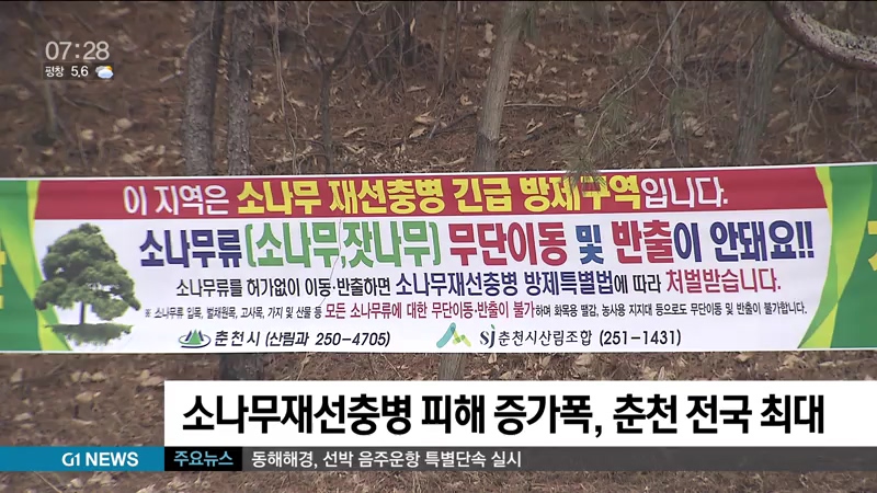 산림청에 따르면, 지난 4월을 기준으로 전국에서 소나무재선충병 피해가 가장 많이 늘어난 곳은 춘천으로, 지난해 천 375그루에서 올해 만 천 550그루로 740% 증가했습니다.