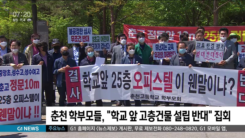 춘천시내 학교밀집지역에 25층 오피스텔 건립이 추진되고 있는 것과 관련해, 인근학교 학부모와 동문 등으로 구성된 '범시민 대책위원회'가 강하게 반발하고 있습니다.