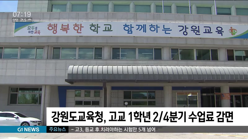 강원도교육청은 코로나19로 등교 수업이 중단된 가운데 올해 무상 교육에서 제외된 고등학교 1학년 학생에 대한 2/4분기 수업료와 운영 지원비를 감면한다고 밝혔습니다.