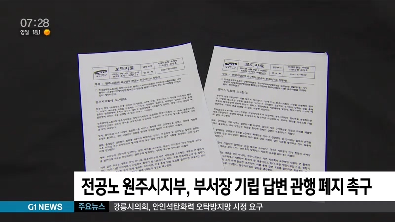 전국공무원노조 원주시지부는 행정사무감사를 앞두고 시의회에 부서장이 일어서서 답변하는 관행 등을 없애야 한다고 요구했습니다.