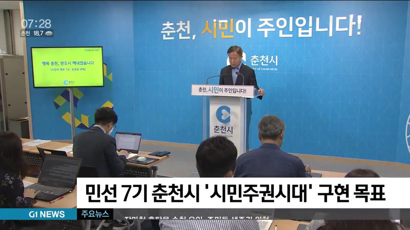 이재수 춘천시장이 민선 7기 취임 2주년을 맞아 기자회견을 열고, 남은 2년 동안 시민이 주도하는 행정시스템을 정착시켜 시민주권시대를 여는데 힘쓰겠다고 밝혔습니다.