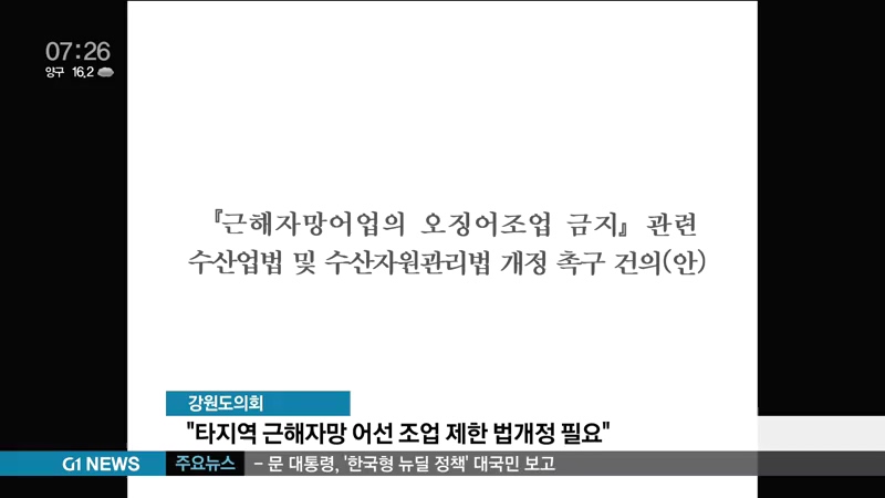 최근 동해안으로 오징어 원정조업에 나선 남해 어선들과 강원도 어선 간 분쟁이 발생하고 있는 가운데 강원도의회가 관련법 개정을 촉구하고 나섰습니다.