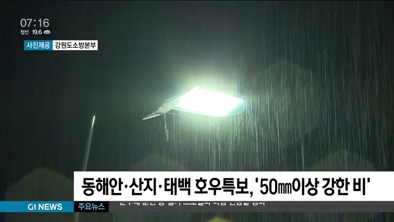 오늘(24일) 오전 7시를 기준으로 강원 동해안과 산지·태백에 호우특보가 내려진 가운데, 시간당 30~50mm 이상의 매우 강한 비가 내리는 곳이 있겠습니다.