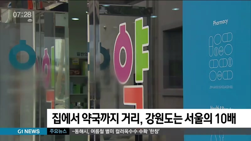 거주지에서 기초 의료 서비스를 받을 수 있는 약국까지 평균 거리가 강원도민은 서울시민의 10배에 이르는 것으로 나타났습니다.