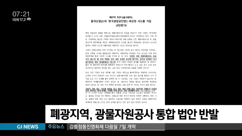 한국광해관리공단 우리노동조합과 태백시 지역현안대책위 등은 어제(27일) 성명서를 발표하고, "법안 재 상정은 광물자원공사의 부실을 떠넘기려는 물귀신법"이라며 백지화를 촉구했습니다.