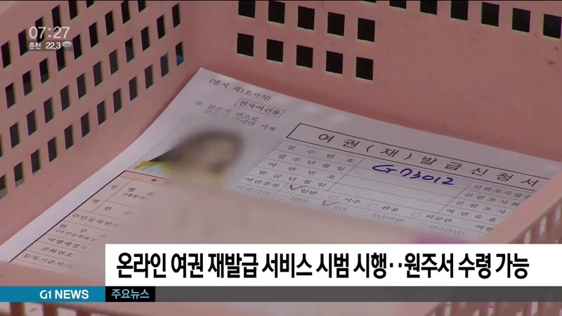 외교부는 온라인 여권 재발급 신청 서비스가 시범 시행돼, 신청 주소와 상관 없이 원주를 비롯한 전국 7개 지역 여권사무대행기관에서 여권 수령이 가능하다고 밝혔습니다.