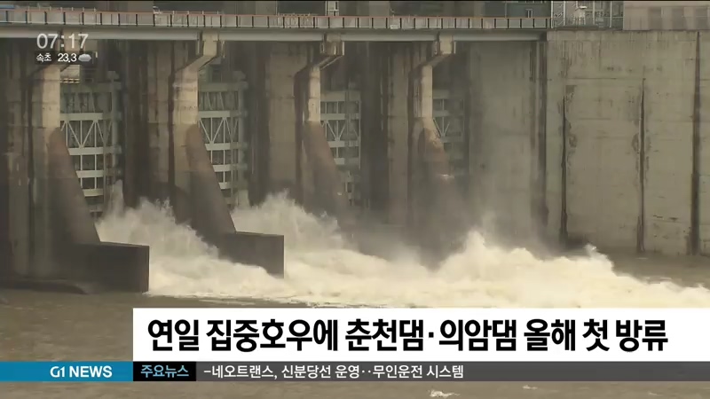연일 많은 양의 장맛비가 이어지면서 춘천댐과 의암댐도 올들어 처음으로 수문을 개방했습니다.