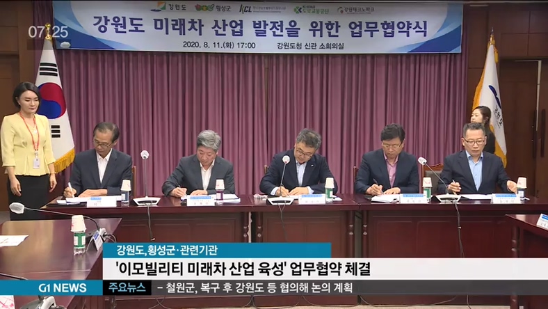 강원도는 도청 신관 소회의실에서 한국건설생활환경시험연구원, 도로교통공단, 강원테크노파크, 횡성군과 '강원도 미래차 산업 발전을 위한 업무 협약'을 체결했습니다.