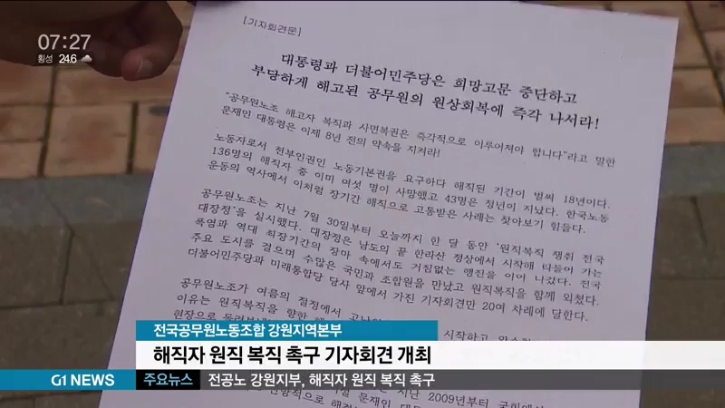 전공노 강원지부는 더불어민주당 강원도당 앞에서 기자회견을 열고, "문재인 대통령이 지난 2012년과 2017년 공약한 공무원 해직자 복직이 조속히 이뤄져야 한다"고 주장했습니다.