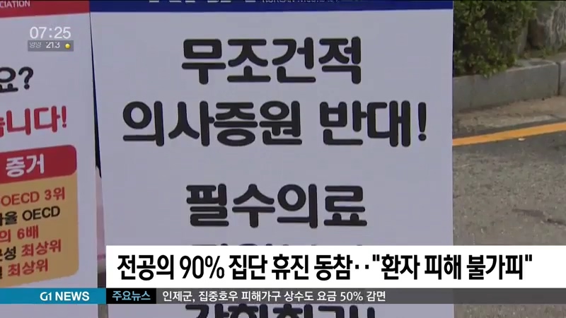 강원도의사회는 강원대병원과 원주세브란스기독병원 등 도내 4개 대형병원 전공의 90% 가량인 350여 명이 집단 휴진에 동참하고 있다고 밝혔습니다.