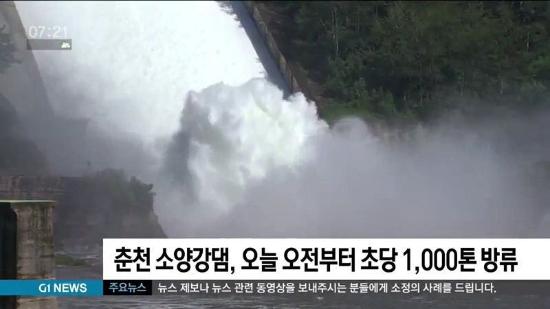 한국수자원공사 소양강댐지사는 안정적인 홍수조절을 위해, 오늘 오전 9시부터 일주일 동안 초당 천 톤씩 물을 방류한다고 밝혔습니다.