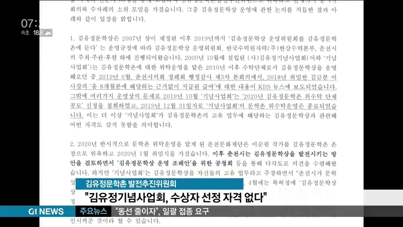 "지난 해를 끝으로 김유정 문학상 수탁운영이 끝난 김유정기념사업회가 올해 문학상 수상자를 일방적으로 발표했다"며 반발했습니다.