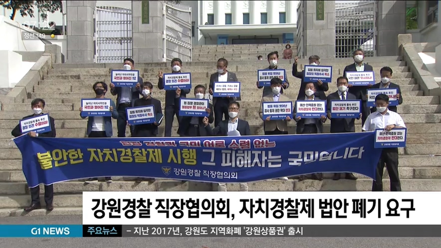 지난 달 국회에 발의된 자치경찰제 도입 법안을 놓고 일선 경찰의 반발이 거세지고 있는 가운데, 강원경찰 직장협의회도 어제(24일) 도청 앞 광장에서 기자회견을 열고 자치경찰 법안의 폐기를 요구했습니다.