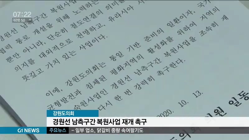 곽도영 도의장은, "경원선 남측구간 철도 복원사업은 단순히 철도 연결의 의미를 넘어 통일기반 준비의 일환이기 때문에 조속히 재개돼야 한다"고 덧붙였습니다.