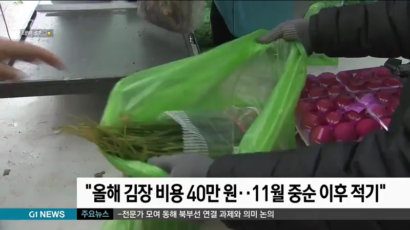 한국물가정보는 "최악의 기상 악화로 주·부재료 값이 모두 상승했다"며 "배추와 무 등 채소 가격이 안정되는 11월 중순 이후부터 김장 준비를 하는 것이 가계에 도움이 될 것"이라고 밝혔습니다.
