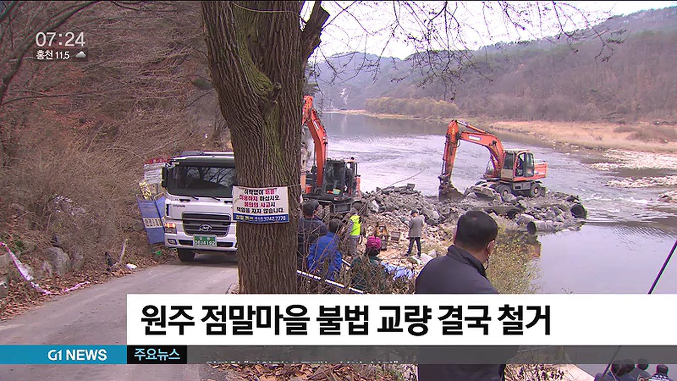 원주시는 어제(17일) 점말마을에 설치됐던 100여m 길이의 불법 교량을 철거하는 행정대집행을 진행했습니다.