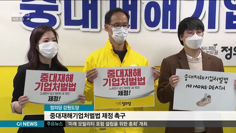 정의당 강원도당은 택배 과로사 등 노동자에게 산업재해가 발생하면 기업주를 처벌할 수 있게 하는 내용의 '중대재해기업처벌법' 제정을 촉구하고 나섰습니다.