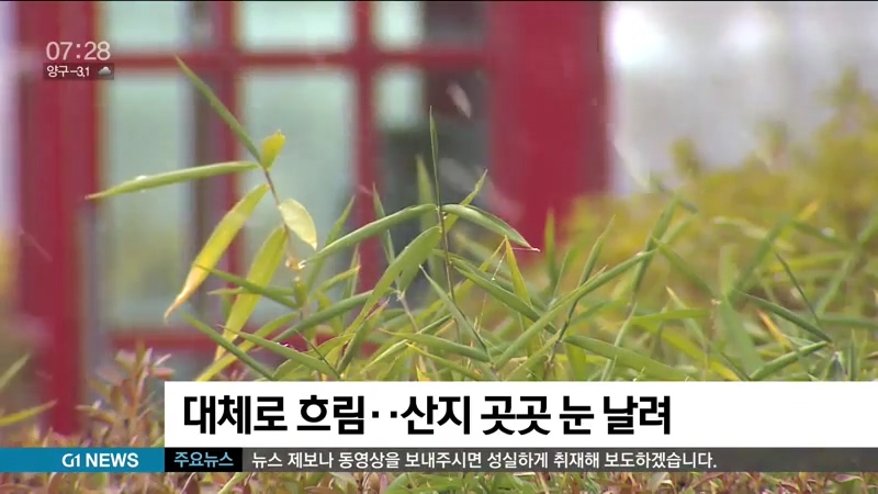 오늘 강원도는 대체로 흐린 가운데, 산간지역을 중심으로 아침부터 낮 사이 산발적으로 눈이 날리는 곳이 있겠습니다.