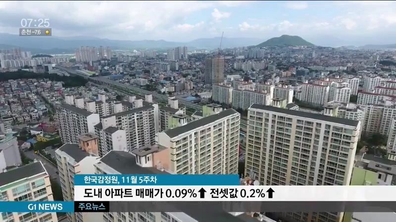 한국감정원에 따르면, 11월 5주차 도내 아파트 매매가 상승률은 0.09%로 떨어져, 강원도 11월 주간 아파트 매매가 상승폭 가운데 최저치를 기록했습니다.
