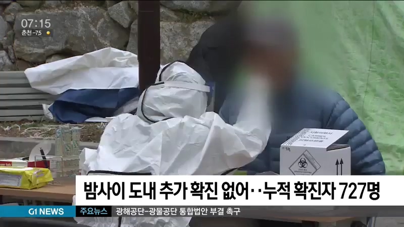 밤사이 도내 추가 확진 없어..누적 확진자 727명
