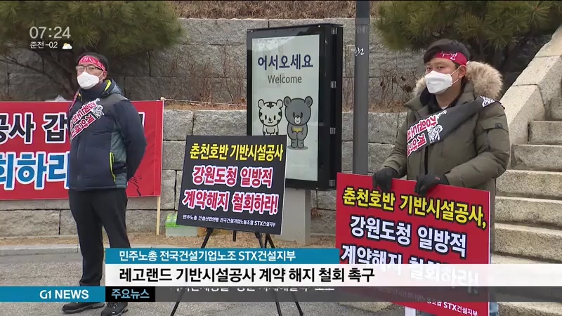 민주노총 건설산업연맹 전국건설기업노조 STX건설지부는 '강원도와 중도개발공사의 일방적인 계약 해지 철회'를 요구하며 강원도청 앞에서 시위를 벌였습니다.