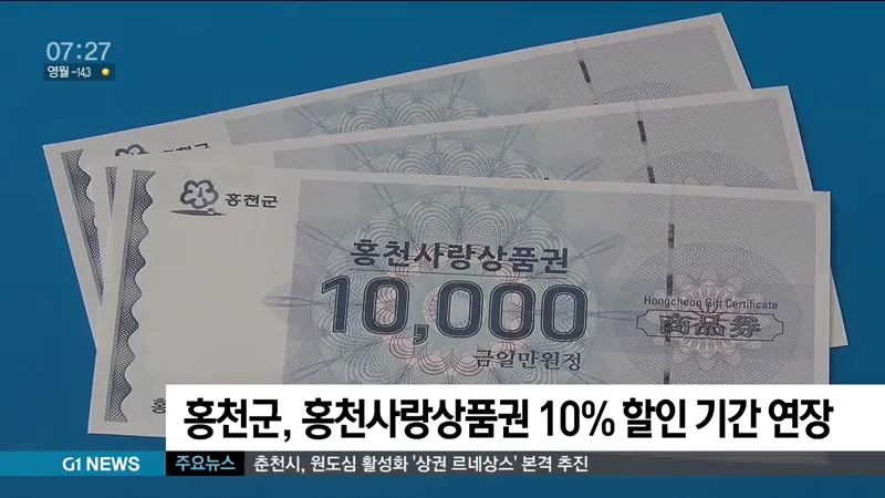 홍천군은 지역 화폐인 홍천사랑상품권의 10% 특별 할인 기간을 예산이 소진될 때까지 연장하고, 1인당 월 구매한도도 100만 원으로 확대한다고 밝혔습니다.