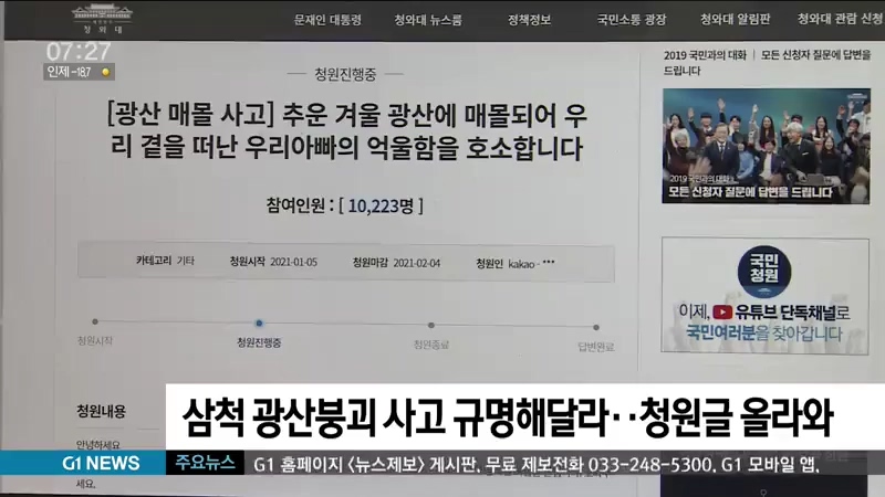 지난달 삼척시 근덕면에서 발생한 광산 붕괴사고와 관련해, 사고 원인을 규명해달라는 유가족의 청와대 청원이 올라왔습니다.