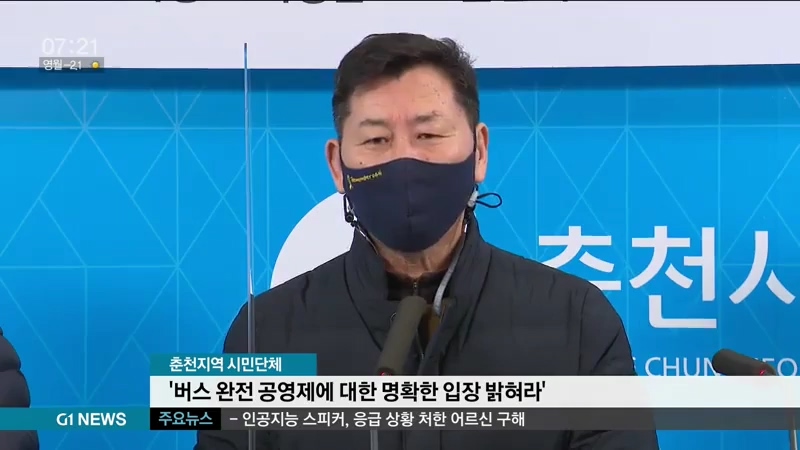 춘천지역 20개 시민단체로 구성된 '춘천 시내버스 문제해결과 완전공영제를 위한 시민대책위원회'는 어제(3일) 춘천시청에서 기자회견을 열고, 버스 완전공영제에 대한 춘천시의 명확한 입장을 촉구했습니다.