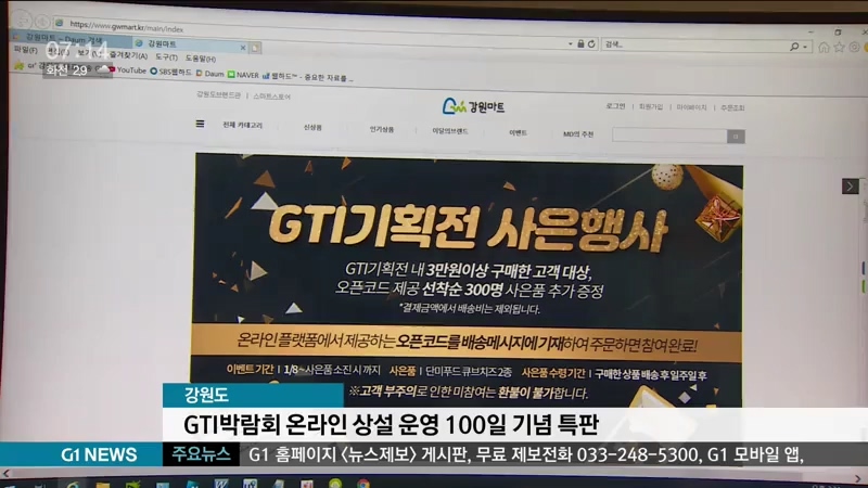 강원도는 내일(15)부터 2주 동안 강원마트, GTI박람회추진센터와 공동으로 온라인 특판전을 열고, 박람회 참가기업 상품 800여개를 최대 40%, 3만 원 한도로 할인 판매합니다.