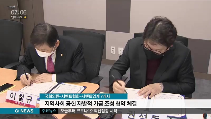 권성동, 이철규, 유상범 의원 등 시멘트 생산지역 국회의원과 시멘트 제조 기업체 대표들은 어제(25일) 국회에서 '지역 사회 공헌 확대를 위한 자발적 기금 조성' 협약을 맺었습니다.