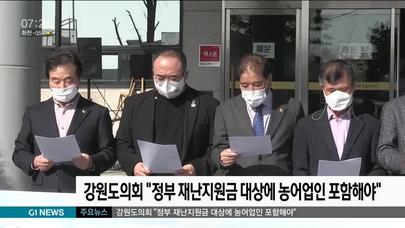 강원도의원들은 건의문을 내고, 정부가 추진하는 4차 재난지원금에서 소상공인은 지급대상에 포함되는데, 자연재해 속에서 속수무책인 농어업이 빠져서는 안된다고 주장했습니다.