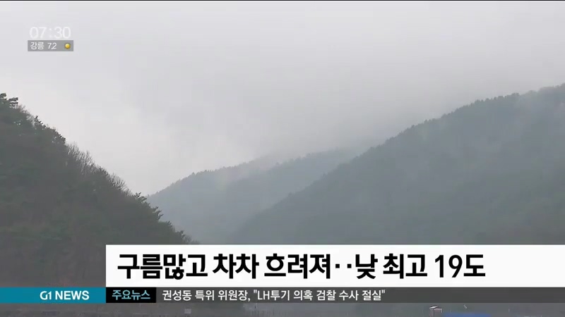 강원도는 오늘(11일) 구름이 많이 끼겠고, 밤부터 차차 흐려져 내일 오후부터는 영동지역을 중심으로 비가 내리겠습니다.