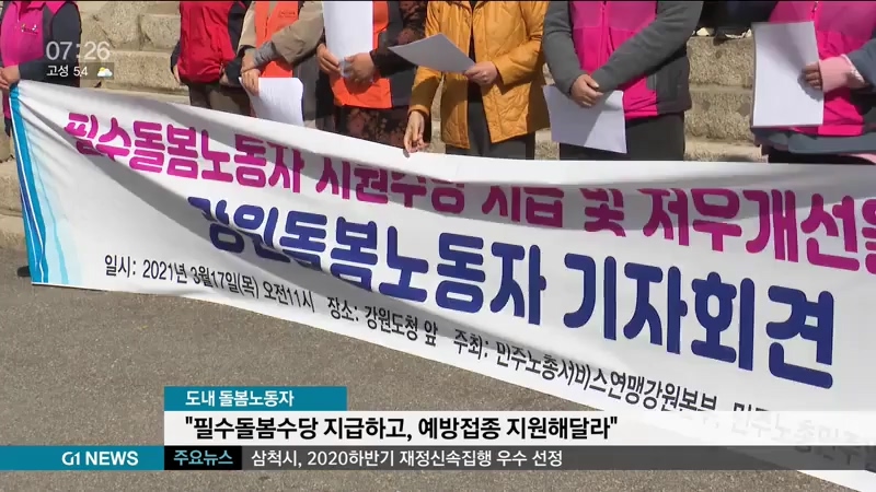 민주노총 서비스연맹 강원본부 학교비정규직노조와 요양 서비스 노조 등 돌봄노동자들은 어제(17일) 기자회견을 열고, 임금개선 등의 처우개선을 촉구했습니다.