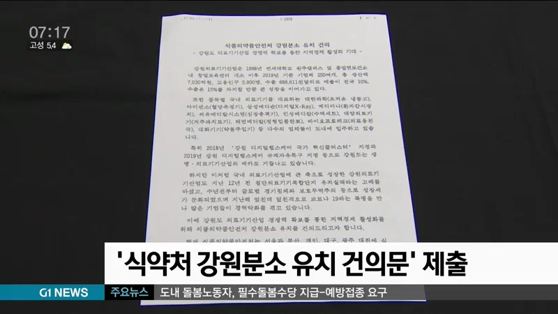 두 단체는 건의문에서 "매출이 전국 10%를 차지하는 강원도 의료기기 산업은 큰 성장을 이어가고 있음에도 심사기관 부재로 시너지 효과를 발휘하지 못 하고 있다"며 식약처 강원 분소가 원주에 설치돼야한다고 강조했습니다.