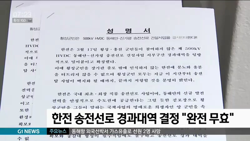 횡성군과 횡성군의회 등은 어제(18일) 긴급 브리핑을 열고 "송전선로는 지역 주민의 생존권과 재산권을 침해하고 환경 파괴를 야기하는 중차대한 사안임에도 한전과 일부 자치단체가 경과대역을 결정했다"고 주장했습니다.